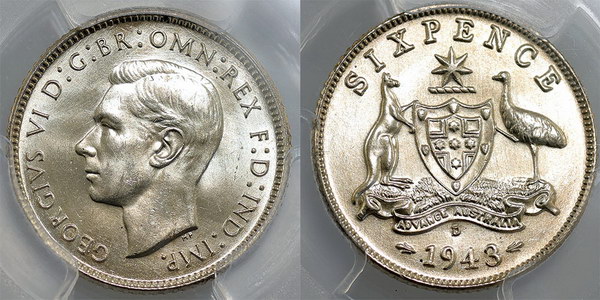 | Description: Sixpence. 1943D. PCGS graded MS 65+ (61241517). Bright frosty mint bloom. GEM UNC |
