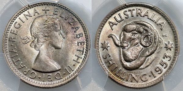 | Description: Shilling. 1953. PCGS graded MS 66 (61241518). Gunmetal grey toned with mint bloom. Equal second highest graded, with only two higher. GEM UNC |