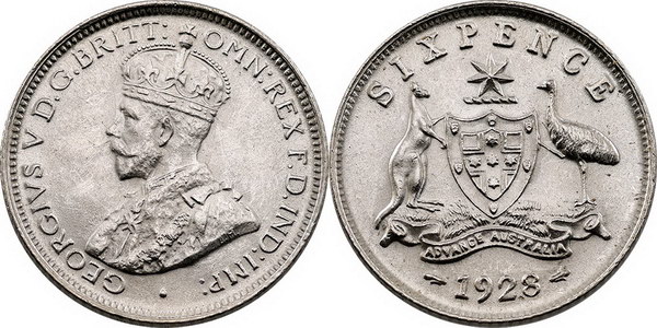 | Description: Sixpence. 1928. Bright frosty bloom, some Obverse marks. UNC/Ch.UNC |
