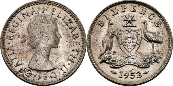 | Description: Sixpence. 1953. Scarce date. Light tone. UNC |