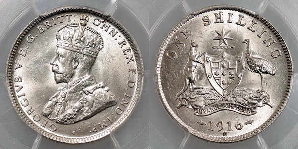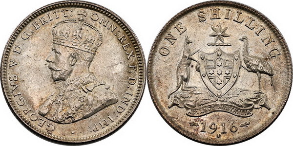 | Description: Shilling. 1916M. PCGS graded MS 63 (84949374). Bright mint bloom. Ch.UNC |