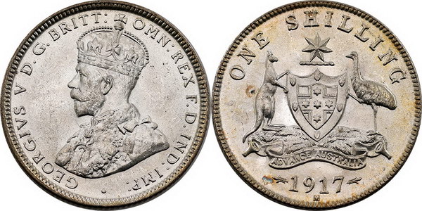 | Description: Shilling. 1917M. Light tone with frosty bloom. Ch.UNC |