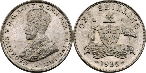 | Description: Shilling. 1935. Light tone with frosty bloom. Ch.UNC |