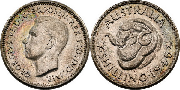 | Description: Shilling. 1944S. PCGS graded MS 65 (49631973). Peripheral tone with frosty mint bloom. GEM UNC |
