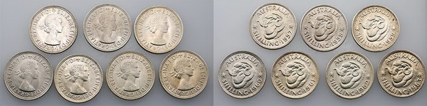 | Description: Shilling. 1957, 1958, 1959, 1960, 1961, 1962, 1963. Light tone. (7 coins total). UNC-Ch.UNC/GEM |