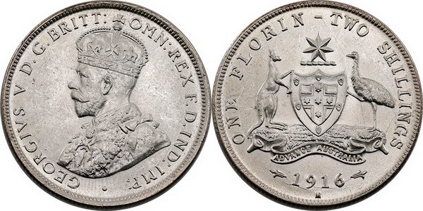 | Description: Florin. 1914. Bright mint bloom, a little weakly struck on Obverse with some marks. UNC/Ch.UNC |