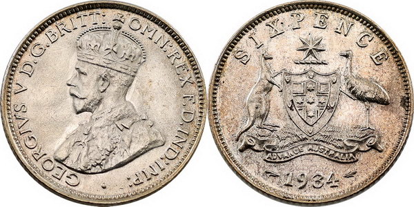| Description: Sixpence. 1934. Some tone with underlying bloom, slight wear to feathers. UNC |