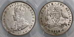 | Description: Shilling. 1918M. PCGS graded MS 64 (24809780). Equal third highest graded, with only 5 graded higher. Peripheral tone with mint bloom. Coin turned in case. Ch.UNC/GEM |