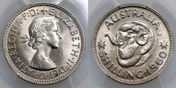 | Description: Shilling. 1960. PCGS graded MS 67 (57515030). Equal highest graded. Bright mint bloom. GEM UNC |