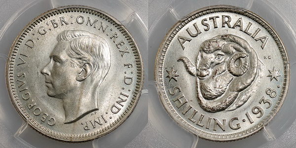 | Description: Shilling. 1938. PCGS graded MS 64+ (83995499). Soft bloom. Ch.UNC/GEM |
