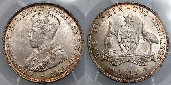 | Description: Florin. 1915. Scarce date. PCGS graded MS 64 (10929097). Light old salmon tone with underlying mint bloom, and a great example of this key date. Equal second highest graded, with only 1 graded higher. Very rare this grade. Ch.UNC/GEM |