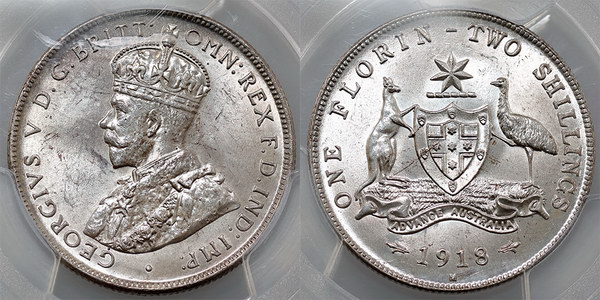 | Description: Florin. 1918M. PCGS graded MS 64 (41004967). Light tone with fresh bright mint bloom, sharp details and an underrated coin in this high grade. Only 4 graded higher. Ch.UNC/GEM |