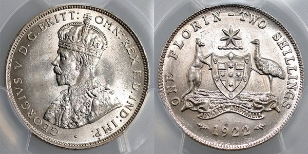 | Description: Florin. 1922. PCGS graded MS 64 (47114250). Light tone with bloom, some surface marks but well struck for this date. An underrated coin in this grade. Only 3 graded higher. Ch.UNC/GEM |
