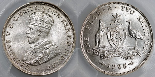 | Description: Florin. 1925. PCGS graded MS 64+ (40554137). Light tone with bright fresh bloom, orange peel Obverse surfaces and well struck. Tough to find in this high grade. Equal third highest graded, with only 4 graded higher. GEM UNC |