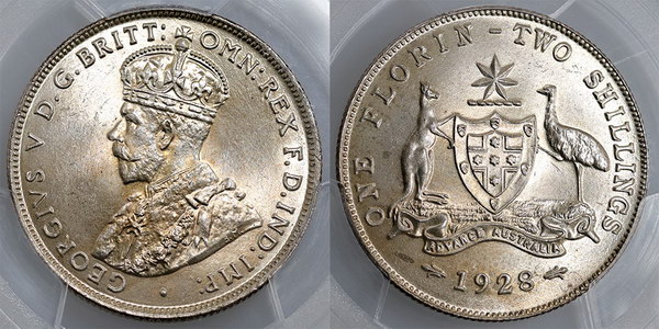 | Description: Florin. 1928. PCGS graded MS 65 (20955519). Light tone with soft mint bloom, sharply struck and virtually mark free and hard to find in this high grade. Equal third highest graded, with only 3 graded higher. GEM UNC |