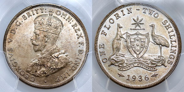 | Description: Florin. 1936. PCGS graded MS 64+ (29888554). Old toned Obverse with frosty Reverse bloom. GEM UNC |