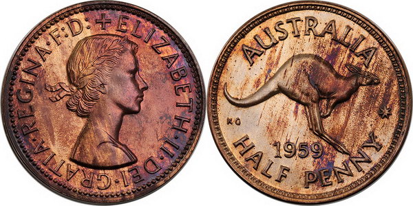 | Description: Halfpenny. 1959 Proof Halfpenny. Some uneven tone with bloom. FDC |