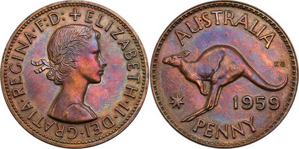 | Description: Penny. 1959 Proof Penny. Mostly purple/brown tone. FDC |