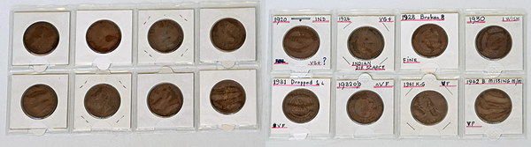 | Description: Penny. 1920 Dot Blow, 1924 Indian Obverse, 1928 broken 8, 1930 date altered forgery, 1931 Dropped 1, 1933/2 overdate, 1941 K.G, 1942Y missing I mintmark. (8 coins total). VG-aVF |