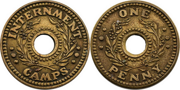 | Description: Penny Internment Camps brass token WW II. EF |