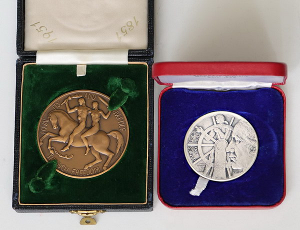 | Description: 1970 National Trust of Aust, Melbourne Captain Cook antiqued silver medallion (51mm/83.53g) by Stokes in case, 1951 Victoria Government Centenary Commemorative bronze Plaque (63mm). Both cased. (2 items total). UNC |