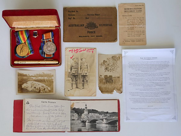 | Description: British War silver medal 1914-1918 and Victory Medal 1914-1919, both with ribbons. Both stamped on edges: 6998 - PTE A.G. JEREMY - 49 BN A.I.F. Also includes: Australian Imperial Forces pay book dated 1916, Demobilisation movement card 13-4-19, photo of Aubery George Jeremy and a couple others, book of annotated postcards with -Merry Xmas to all 1918- on front in pencil and autograph book filled with handwritten inspirational quotes 1937-1945 and gold-plated Conway Stewart fountain pen. (9 items total). |