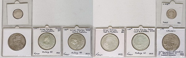 | Description: Australia Silver Jubilee Royal Visit silver token 1977 (40mm) Low mintage of 100 (2), Ethiopia 25th Anniversary of Coronation Haile Selassle and Empress Waizero 1955 cuni (40mm) and Diana the Peoples Princess uniface silver token 1997 (23mm). (4 items total). EF-UNC |