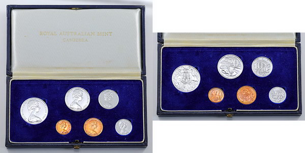 | Description: Sets. 1966 Pattern Trial strike 1966 Proof set, 1 Cent to Round 50 Cent. Struck in c1965 in the style of the 1963 Proof set, with full brilliant Specimen Proof polished finish rather than the frosted and brilliant style of the officially released sets. Likely came about as a trial design or hastily prepared sample. Unique, and a highly important piece of Australian numismatic history and poignantly offered on the Centenary year of the Decimal series. In dark blue RAM case, coins perfect. Unique. FDC |