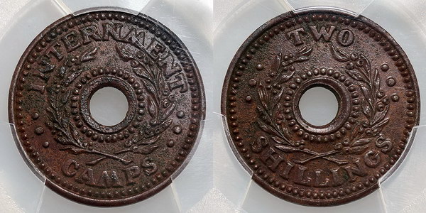 | Description: Two Shillings copper WW II Internment Camp token. PCGS graded Genuine - Environmental Damage - AU DETAIL (49193719). Light pitting but good details, dark toned. gVF |