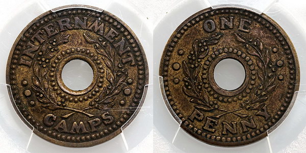 | Description: Penny Internment Camps brass token WW II. Toned. gVF |