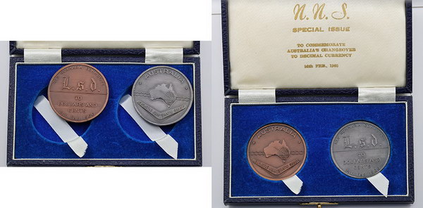 | Description: Newcastle Numismatic Society 1966 Decimal Changeover 2-medallion cased set (38mm; look to be copper and pewter). UNC |