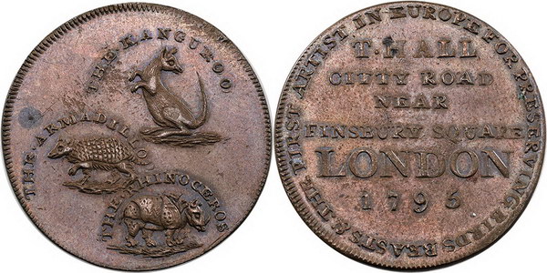 | Description: Penny. Great Britain Hall, T copper Penny token, London 1795. Brown lustre, Obverse spot. Reverse depicts three exotic animals (Kanguroo, Armadillo, Rhinoceros); the earliest known depiction of a kangaroo on a numismatic item (see Australian Coin Review July 2025 (pg 24). Historically important and rare. EF |