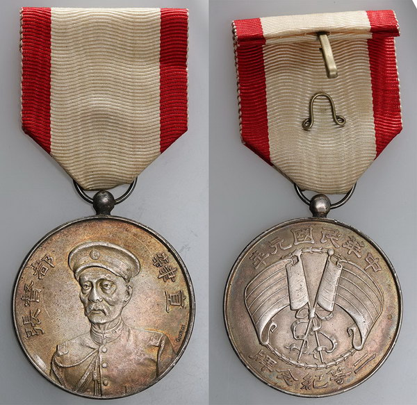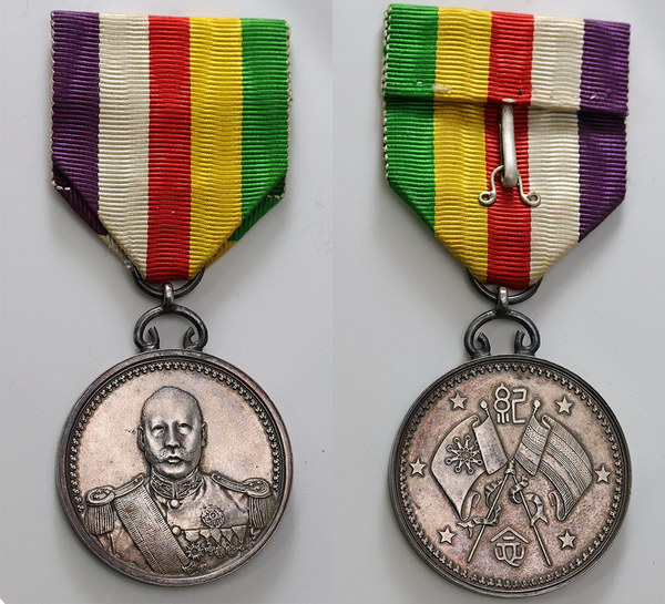 | Description: China Republic medal in silver, crossed flags Reverse. With red and white ribbon. Scarce. EF |