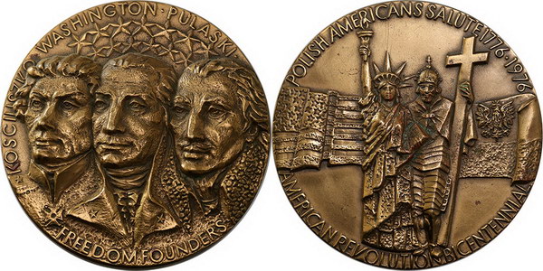 | Description: 1976 USA Poland Salute American Revolution Centennial large bronze medallion with three portraits (70mm). aUNC |