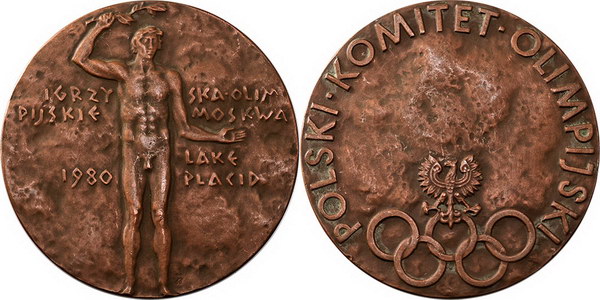 | Description: 1980 Lake Placid Polish Olympics Committee copper medal (70mm). aEF |