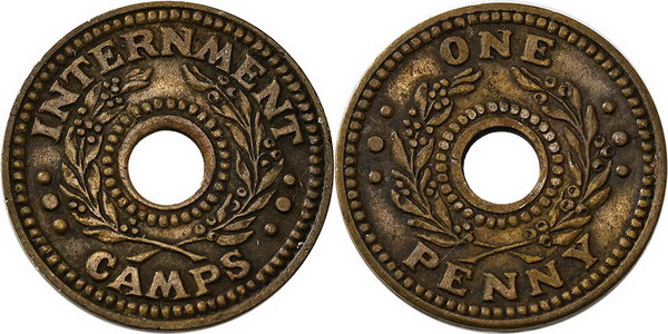 | Description: Penny Internment Camps brass token WW II. EF |