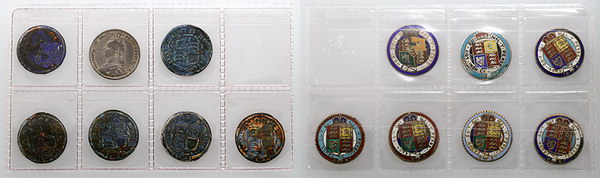 | Description: GB colour-enamelled copy Sixpences (1700-1880s dated). 7 varieties. Made by a jeweller in Chipping. Interesting. (7 items total). aVF-gVF |