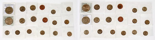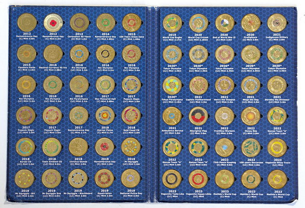 | Description: Assorted. Small album of Decimal coins. Includes: 1 Cent 1966C (2), 1966M, 1966P, 1968,1985 (2), 1987, 1988, 1989, 1990, 2006, 2016, 2019 Possum Magic, 2 Cent 2016, 20 Cent 2004 Proof (2), 2022, 50 Cent 1977 (2; one rotated 10 deg), 1981 Charles and Di, 1982 Comm Games, 2005 Comm Games, 2006, 2018, 2024 Naidoc, 1 Dollar 2018 Anzac, 2025 Matildas, 2 Dollars coloured 2016 Olympic Team, 2022 Comm Games (5), 2022 Honey Bee (4), 2022 Matildas, 2023 Vegemite red, 2024 Olympic Team, 2024 War Animals. In small Numis album, most Unc. (42 coins total). EF-FDC |