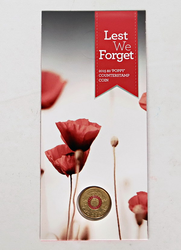 | Description: Two Dollar. 2015 Lest We Forget coloured with Poppy counterstamp. On RAM card. Scarce. UNC |