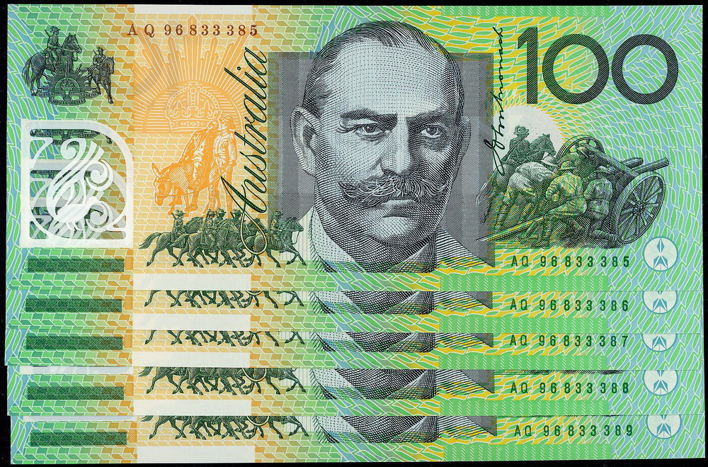 | Description: 1996 polymer Fraser-Evans AQ 96 (R 616T). Consecutive run of 5 Test notes; the second note with a 7 digit radar serial AQ (9)6833386. Slight flick at top and bottom from rubber band. Scarce as such. (5 notes total). UNC |