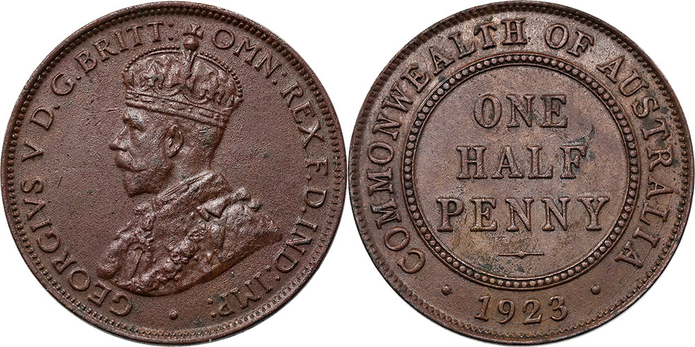 | Description: 1923. Key date. Even brown, eight pearls and centre diamond with full band. Minor Reverse planchet flaw and peripheral die crack through part of legend on Obverse. Ex Downies S 321 May 2016 Lot 998 (sold post-auction) and IAG S 98 (lot 1740). Rare this grade. aU/UNC |