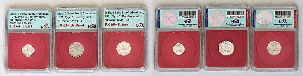 India Proof 1 Paisa, 2 Paisa, 3 Paisa 1971B. NGS India graded PR64+ Pearl, PR60+ Prime, PR63+ Brilliant. (3 coins total).
