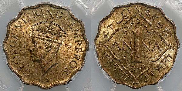 India (British) Anna 1942C. PCGS graded MS 63 (48375018). George VI. Lustre.
