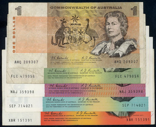 | Description: 1967 Coombs-Randall set of 5 notes, 1 Dollar to 20 Dollars (R 72), (R 82), (R 202), (R 302), (R 402). The key decimal signatures and high catalogue value. Mostly well-circulated; the 1 Dollar with a taped tear and pinholes, 2 Dollar with a small edge split, 5 Dollar crisp with folds, 5, 10 and 20 Dollar with folds. (5 notes total). aF-gVF |