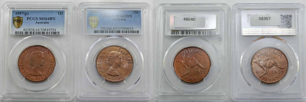 | Description: 1957Y, 1958Y. PCGS graded MS 64 BN and MS 63 BN respectively (30849554, 35590633). Red/brown and bright lustrous red/brown). (2 coins total). Ch.UNC-GEM |