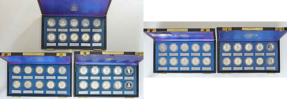 | Description: Famous Freemasons complete set of 50 sterling silver Proof medallions N/D (1960s). Each coin 0.845 oz/39 mm. Privately struck by the International Fraternal Commemorative Society. Each coin depicts and commemorates the life of a famous member of the Freemasons including George Washington, Ben Franklin, Paul Revere, John Hancock, John Paul Jones, George C. Marshall, J. Edgar Hoover, John Phillip Sousa, Will Rogers, and others. Interestingly the Paul Revere medal is the Obverse doubled die variety by Jefferson Nickel designer, Felix Schlag. In five hinged cases with presentation plaque to Herman S. Maul IFCS Membership No 0288 and certificate, some with slight milky toning. Scarce. FDC |