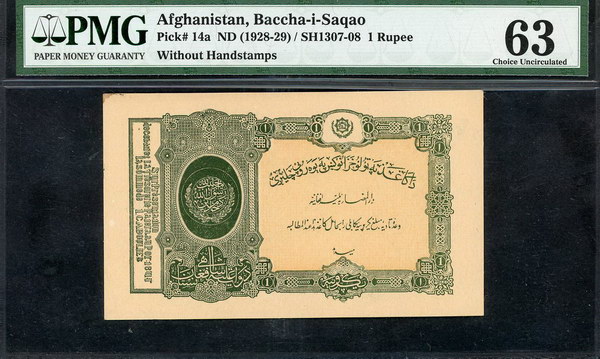 | Description: Afghanistan, Baccha-I-Saqao 1 Rupee N/D (1928-29) (P 14a). PMG graded 63 Choice Unc (8051371-003). Without additional handstamps, uniface. Slight mark to top left corner. Scarce this grade. |