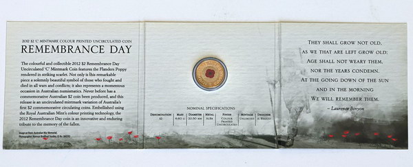 2012C Remembrance Day coloured red poppy c mintmark issue. In RAM card. A popular issue, catalogues at $800.