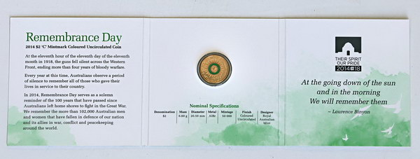 2014C Remembrance Day coloured green Dove, c mintmark. In RAM folder. Scarce issue with high retail value.