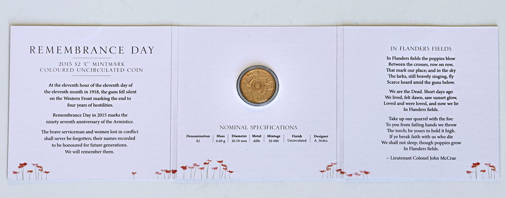 2015C Remembrance Day coloured Unc (Flanders Fields), c mintmark issue in RAM pack. High retail value.